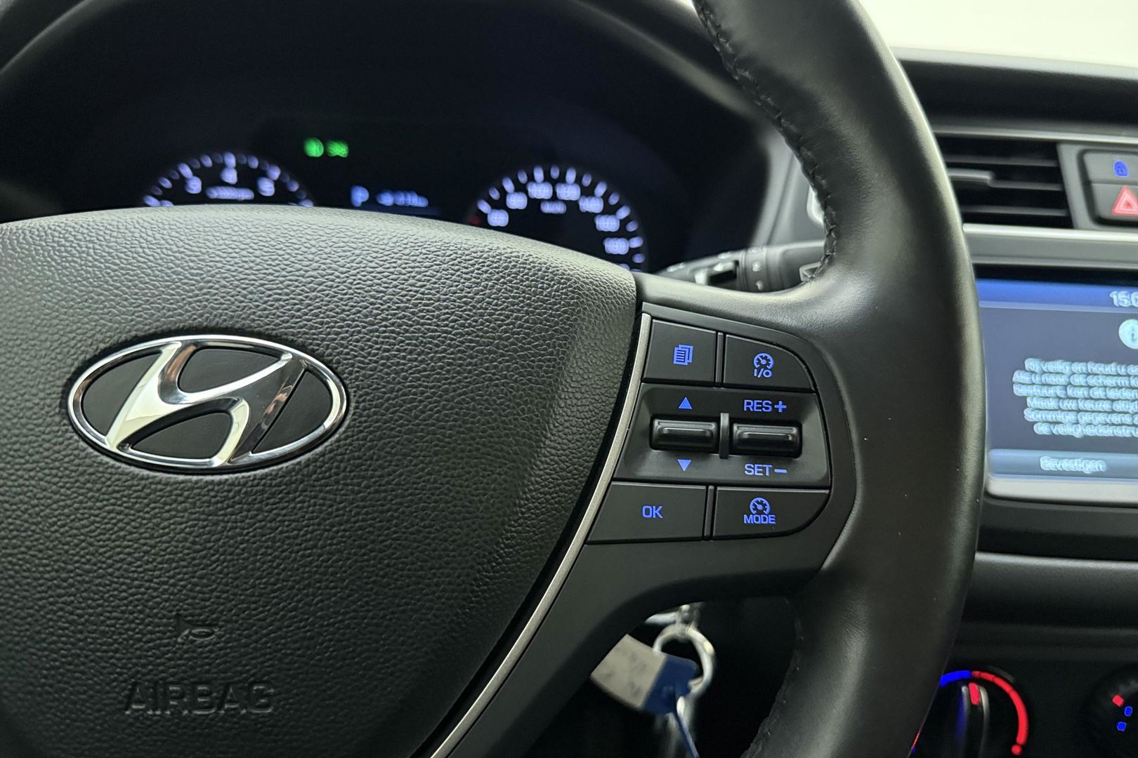 Zoals u mag verwachten van deze Hyundai i20 is hij uitgerust met een reeks aan actieve veiligheidssystemen. Een camera houdt de juiste koers binnen de rijstrook in de gaten en het Lane-keeping systeem corrigeert bij afwijkingen. De auto is ook uitgerust met hill hold functie en bandenspanningcontrolesysteem.