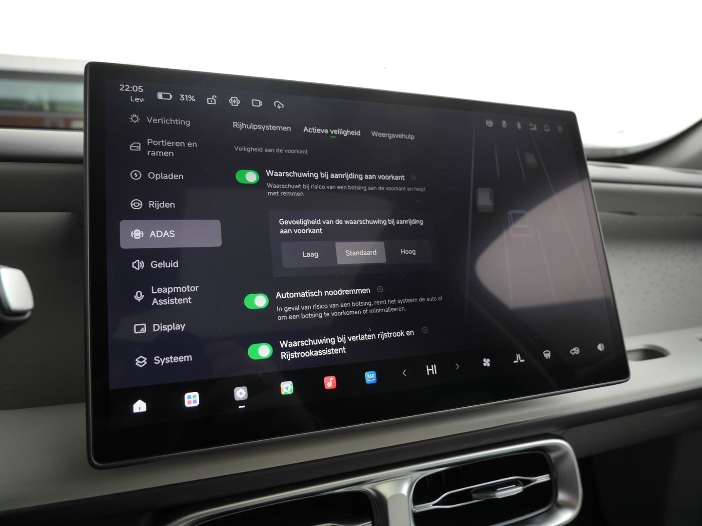 Elektronische veiligheidsvoorzieningen helpen u onderweg om de situatie op de weg te beoordelen. Deze systemen waarschuwen u als er een riskante situatie ontstaat, en kunnen in bepaalde gevallen ook zelf ingrijpen. Met het Lane-keeping systeem komt u nooit per ongeluk buiten de rijstrook. Ook als uw aandacht even verslapt, blijft de forward collision warning bij de wekker. Dreigt er een botsing met een voor- of tegenligger, dan waarschuwt het systeem direct. Met de vermoeidheidsassistent bent u ook op lange ritten veilig op pad. Het systeem geeft een waarschuwing zodra het tijd is voor een pauze. De veiligheid van deze auto wordt verder verhoogd door dodehoekdetectie en brake assist.