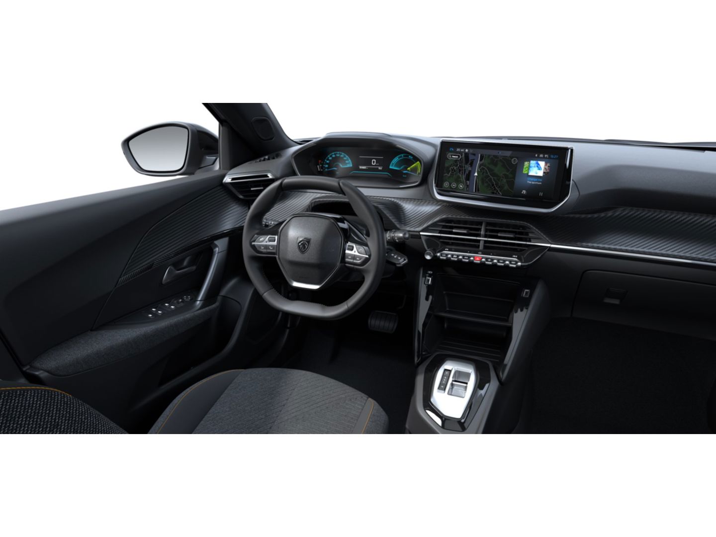 Dashboard in zacht materiaal met carboneffect en hoogglans zwarte sierstrip