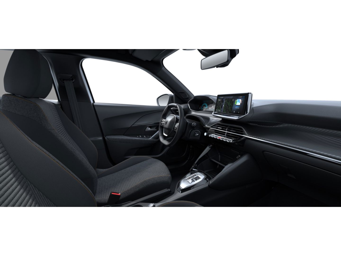 Dashboard in zacht materiaal met carboneffect en hoogglans zwarte sierstrip