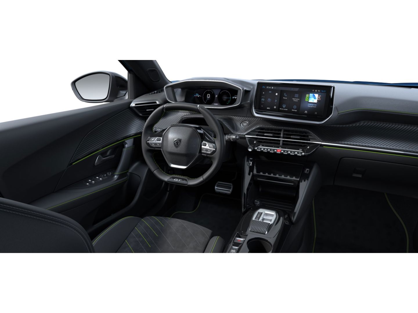 Geperforeerd lederen sportstuurwiel afgewerkt met groen stiksel en GT-logo