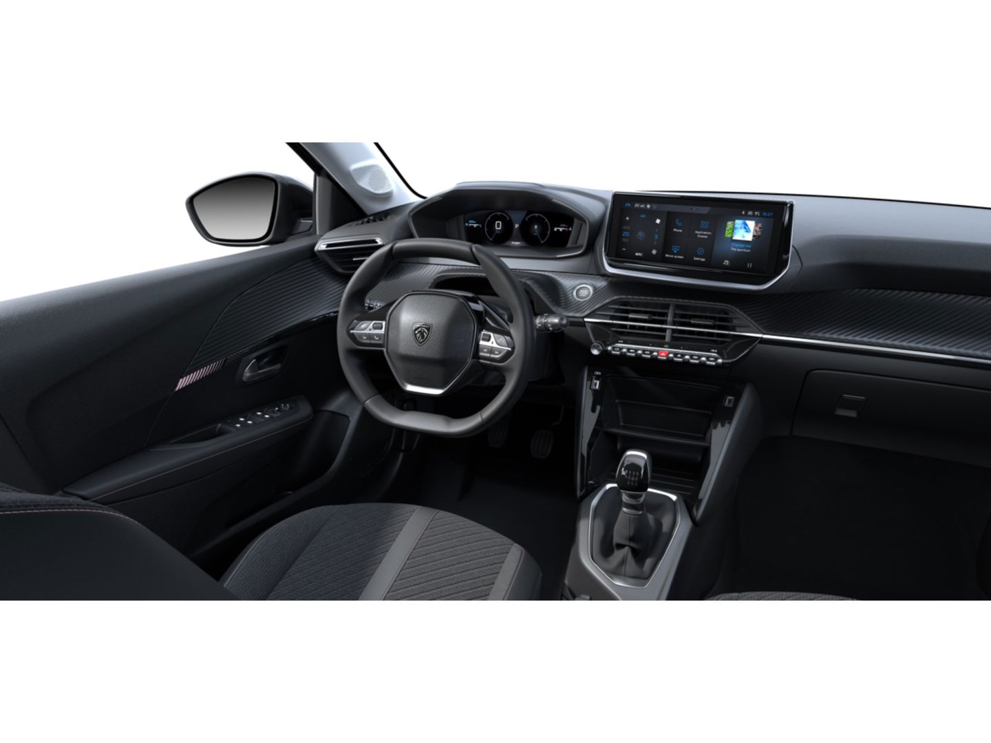 Dashboard in zacht materiaal met carbon TPE afwerking en glanzend zwarte strip met chroomaccent