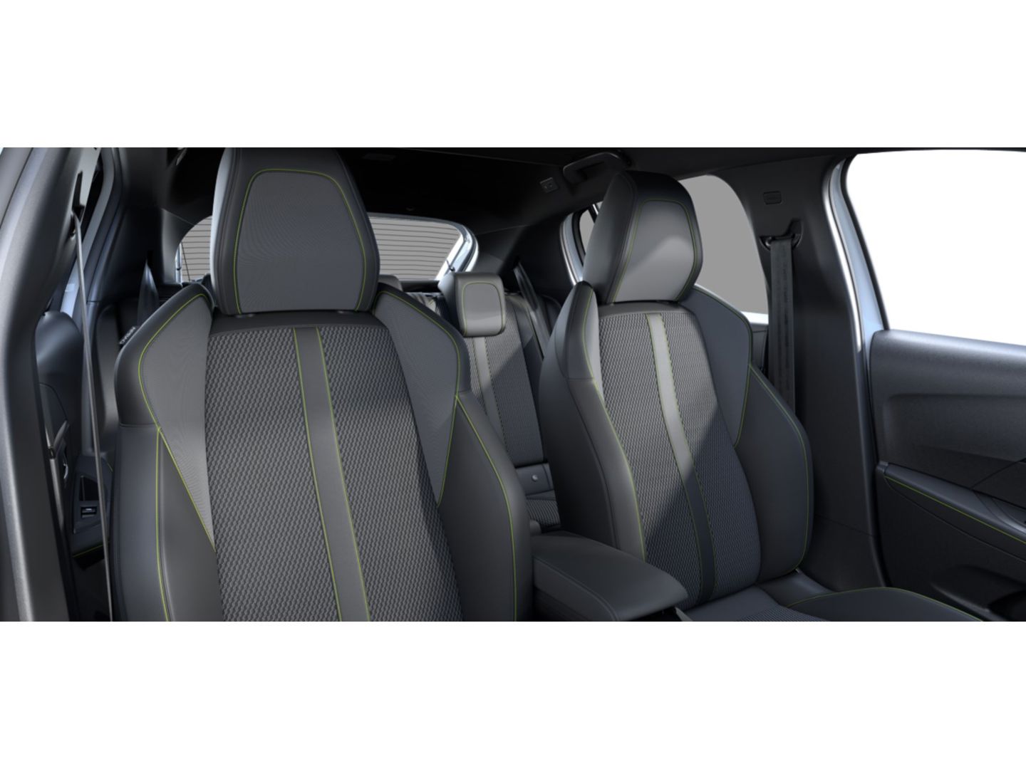 Portierpanelen vóór met Carbon TPE afwerking, glanzend zwarte strip en stiksel in groen Adamite op de portiergreep
