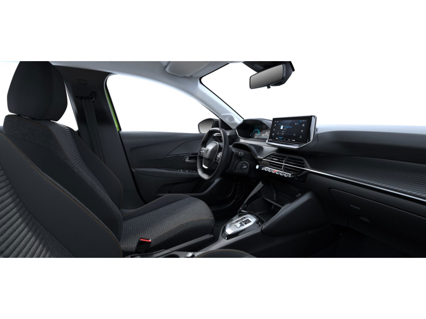 Dashboard met decor in carbon en glanzend zwarte strip met chroomaccent en zwart paneel.