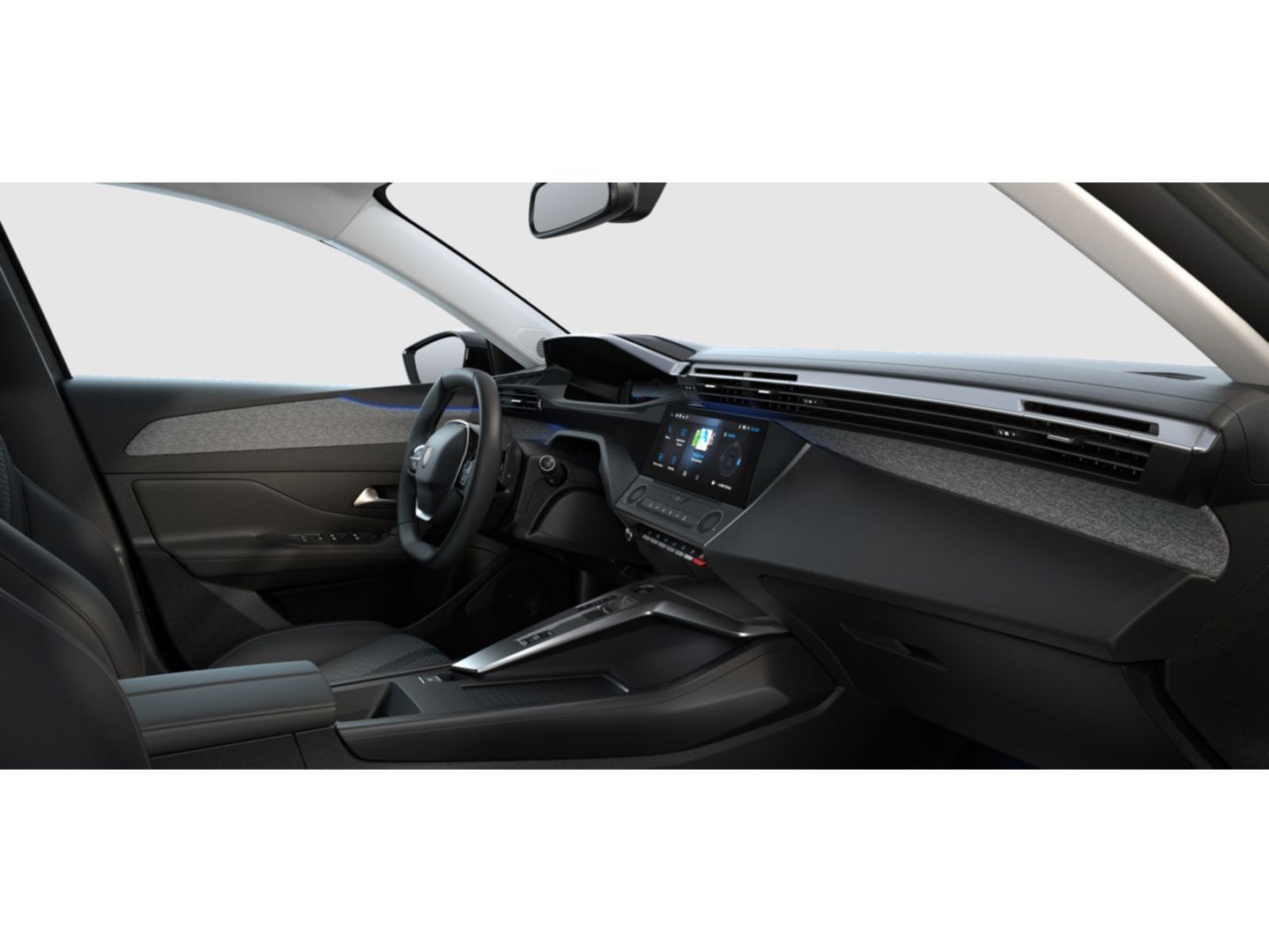 Zacht dashboard bekleed met grijze gemêleerde stof, grijze stoffen decoratie en grijze sierlijst
