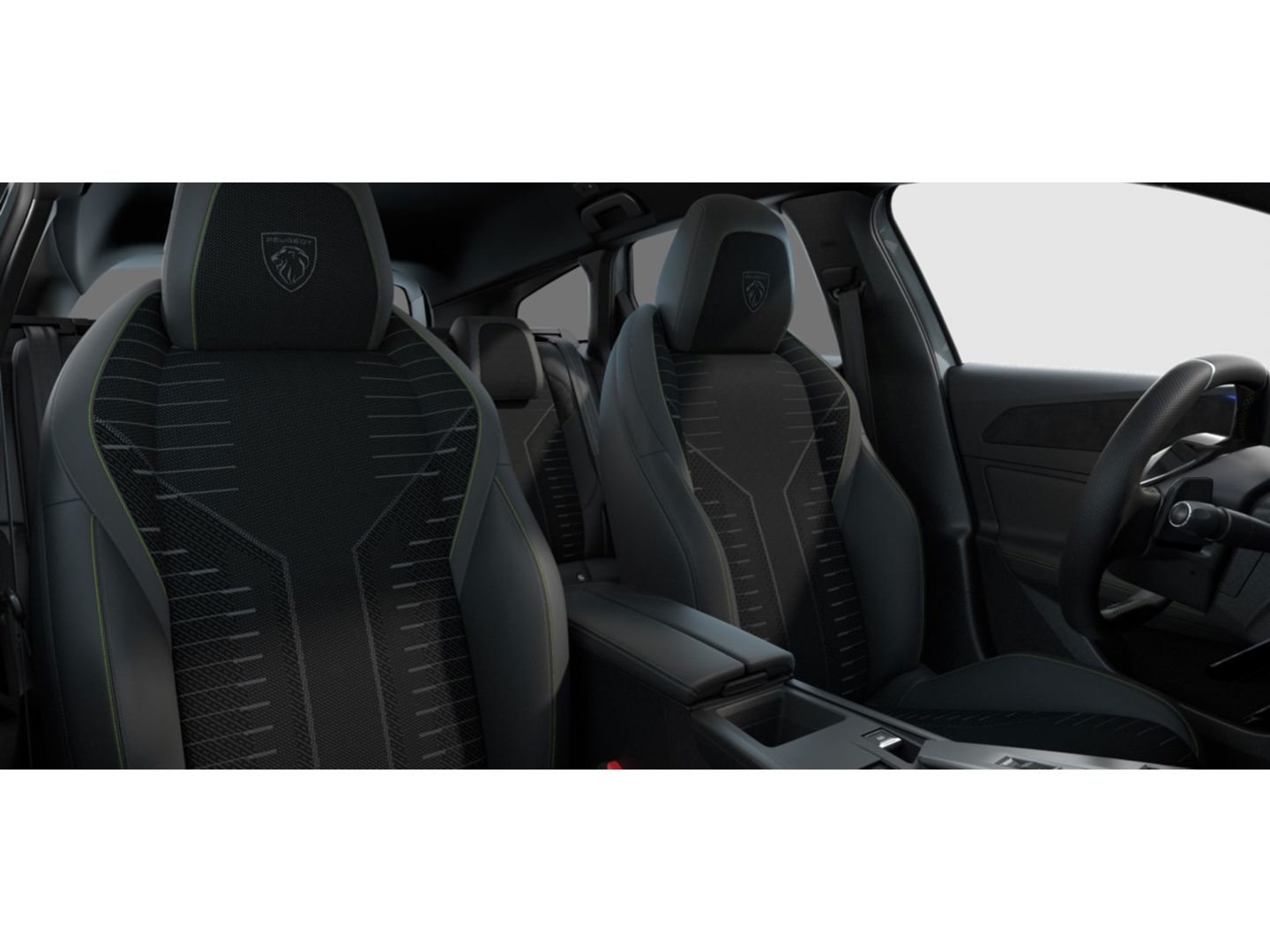 Compact, met generfd en geperforeerd leder bekleed 'GT' stuurwiel met geïntegreerde bedieningsknoppen, stiksels in groen Adamite
