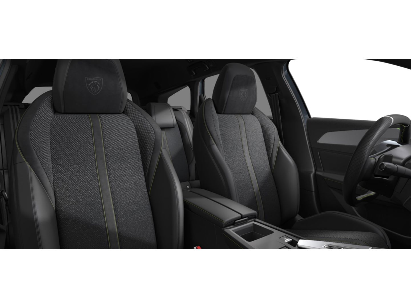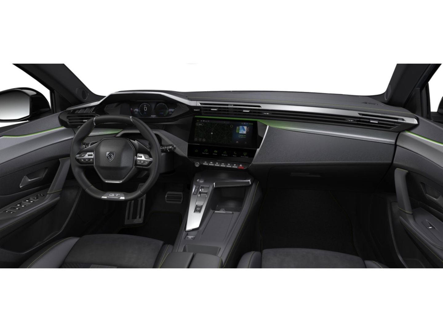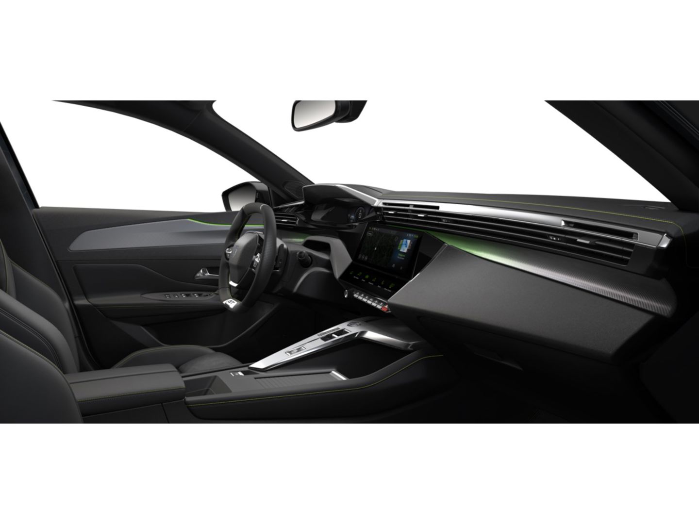 Dashboard, middenconsole en stuurwiel afgewerkt met groen stiksel