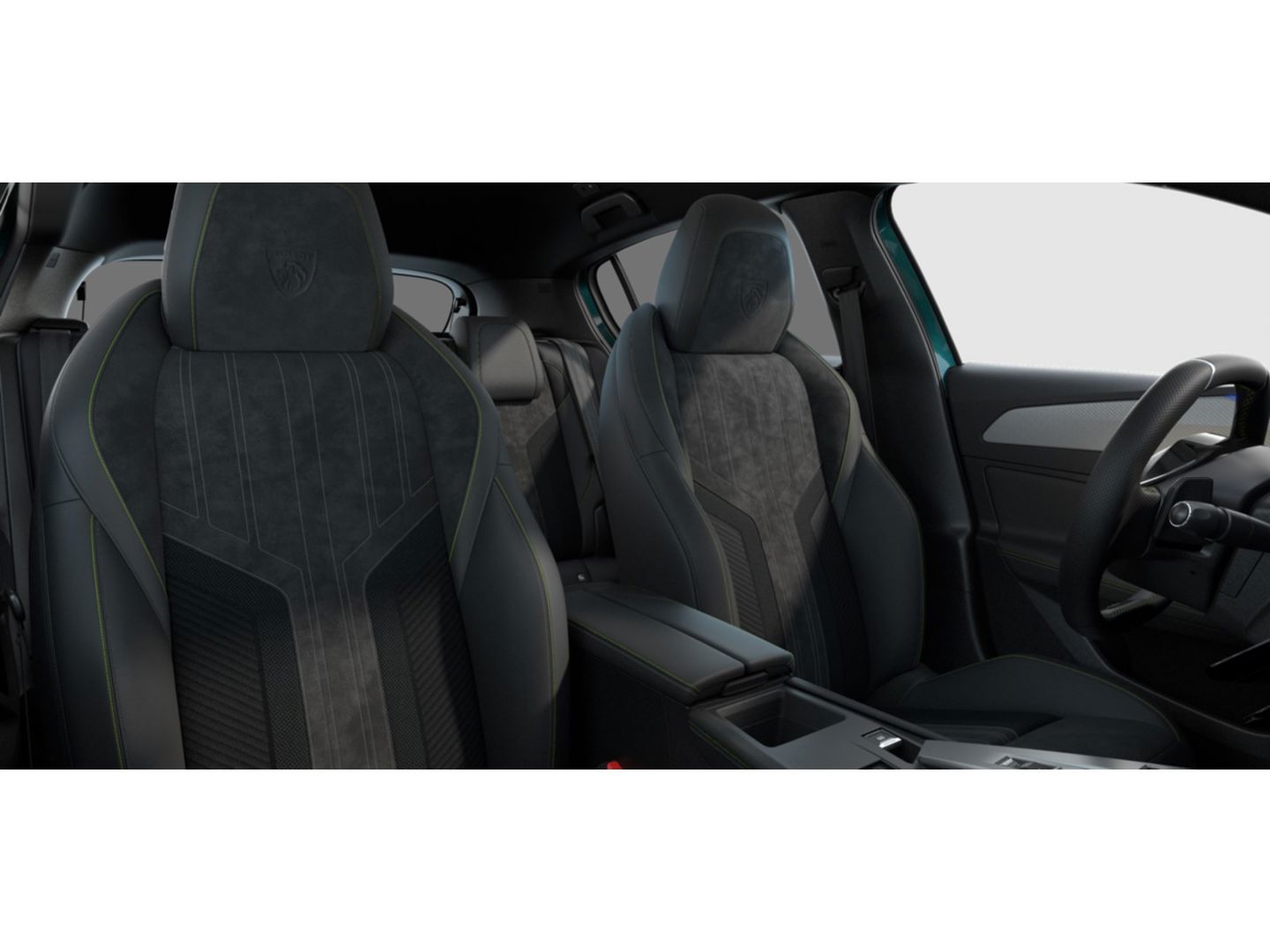 Compact, met generfd en geperforeerd leder bekleed 'GT' stuurwiel met geïntegreerde bedieningsknoppen, stiksels in groen Adamite