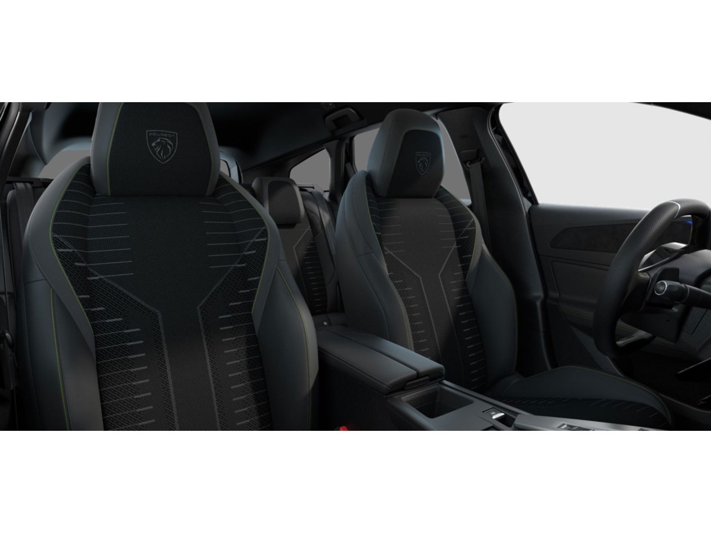 Compact, met generfd en geperforeerd leder bekleed 'GT' stuurwiel met geïntegreerde bedieningsknoppen, stiksels in groen Adamite