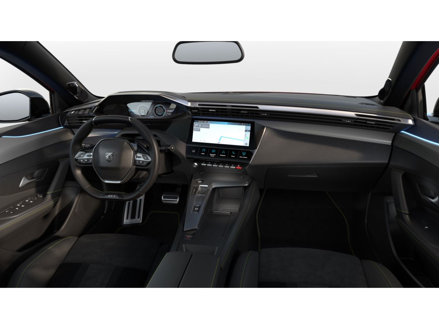 Compact, met generfd en geperforeerd leder bekleed 'GT' stuurwiel met in glanzend zwart uitgevoerde geïntegreerde bedieningsknoppen