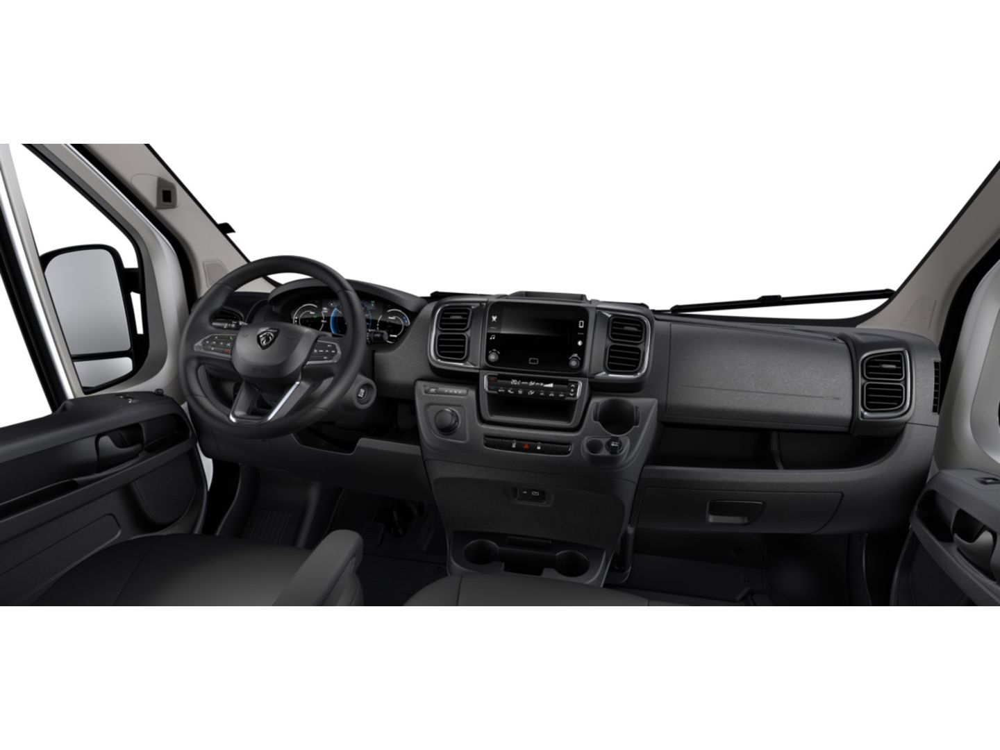 Centraal geplaatst open opbergvak inclusief bekerhouders (flessen tot 0,75ltr) en ruimte voor kleine spullen zoals smartphones en een USB aansluiting (USB aansluiting alleen indien een radio wordt besteld)