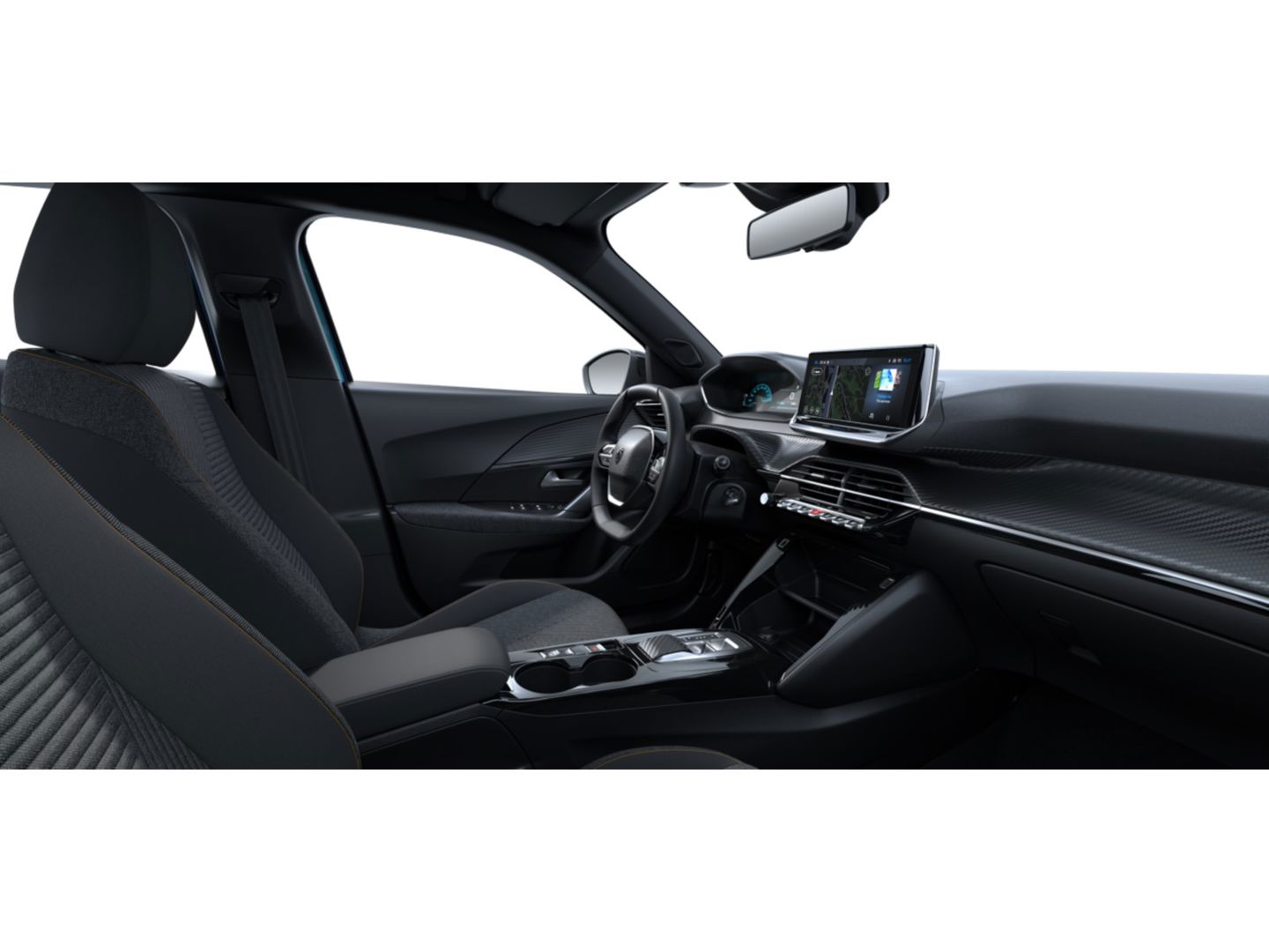 Dashboard in zacht materiaal met carboneffect en hoogglans zwarte sierstrip