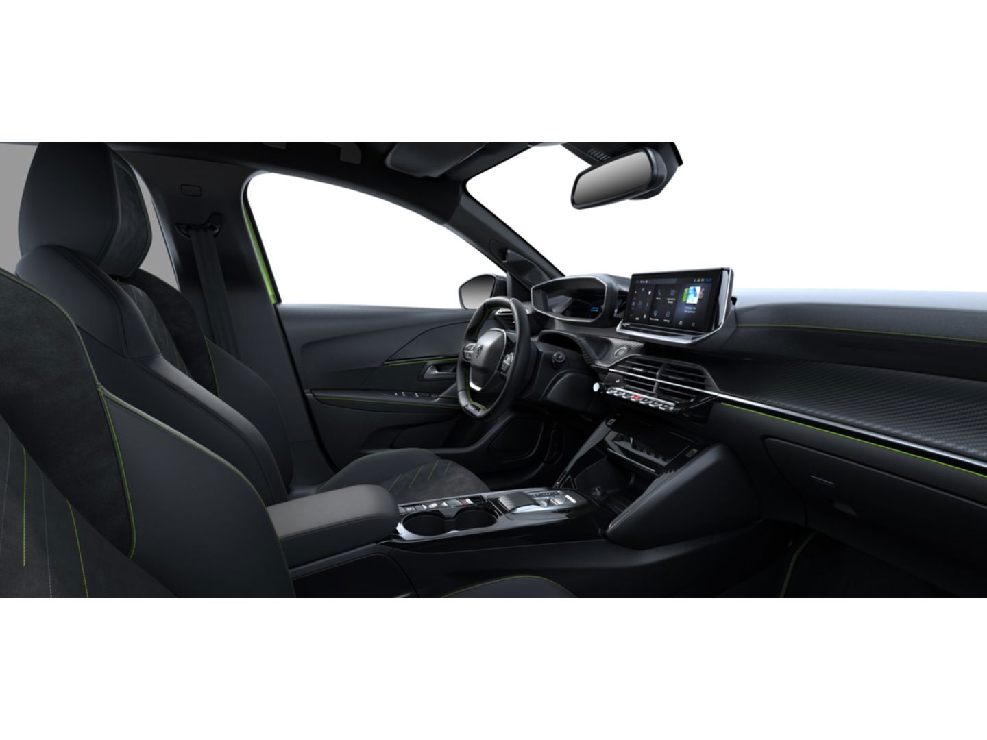 Portierpanelen vóór met Carbon TPE afwerking, glanzend zwarte strip en stiksel in groen Adamite op de portiergreep