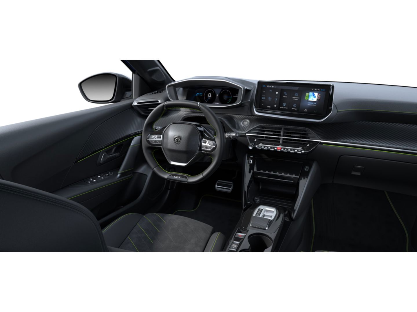 Compact, met generfd en geperforeerd leder bekleed 'GT' stuurwiel met geïntegreerde bedieningsknoppen, stiksels in groen Adamite